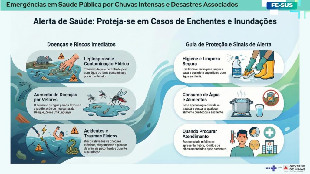 Diante do cenário, a Secretaria de Estado de Saúde de Minas Gerais (SES-MG) alerta para o aumento do risco de doenças como leptospirose, Doenças Diarreicas Agudas (DDA), arboviroses (como dengue e chikungunya) favorecidas pelo acúmulo de água parada, além de acidentes com animais peçonhentos.