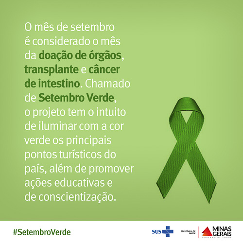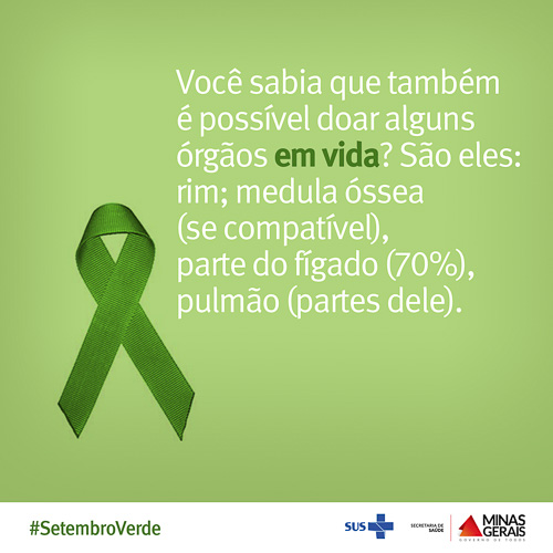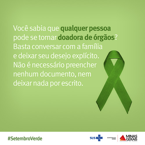 Para ampliação do acesso ao programa brasileiro de transplantes, houve aumento de 30% no investimento na área, chegando a R$ 1,27 bilhão em 2014. Esses recursos concentram-se na realização das cirurgias e em todo o processo que garante o sucesso do transplante, como incentivo à doação e captação de órgão, uma rede de informação bem articulada em todo o país, oferta de medicamentos, exames e acompanhamento dos pacientes. Abaixo, confira a galeria de banners da campanha do “Setembro Verde” da Secretaria de Estado de Saúde de Minas Gerais (SES-MG):
