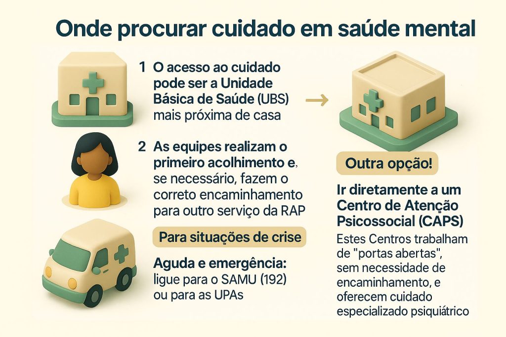 A porta de entrada para o cuidado pode ser a Unidade Básica de Saúde (UBS), o posto de saúde mais próximo de casa. As equipes realizam o primeiro acolhimento e, se necessário, fazem o encaminhamento correto para outro serviço da RAPS. Outra opção é o Centro de Atenção Psicossocial (CAPS). Esses centros funcionam de “portas abertas”, sem necessidade de encaminhamento, e oferecem atendimento especializado para sofrimento psíquico mais intenso.